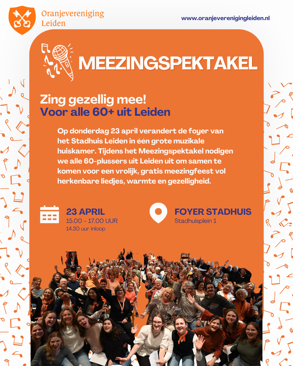 De foyer van het Stadhuis verandert Leiden in één grote muzikale huiskamer. Alle 60-plussers uit Leiden zijn van harte uitgenodigd om gratis mee te komen zingen tijdens dit vrolijke meezingfeest vol herkenbare liedjes, warmte en gezelligheid.